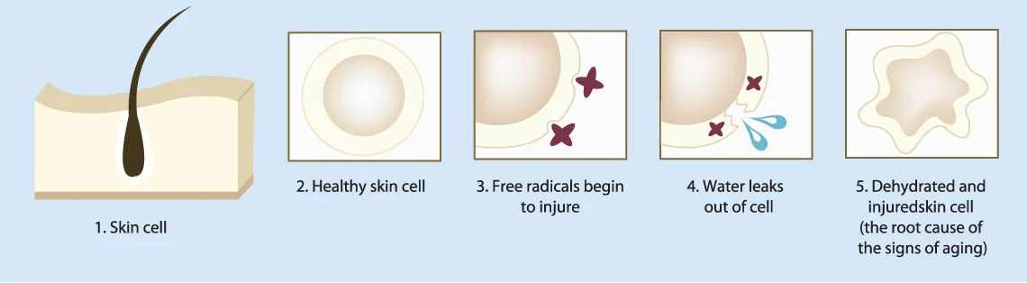 Free radicals are destructive molecules. They destroy the integrity of other molecules. They first attack and destroy the walls of your skin cells. So if you imagine your cells as being like a water balloon. Free radicals are like a knife that pokes holes into it. The balloon will then leak like a sieve and your cells become dehydrated. They become deflated and dehydrated, because all the vital fluid and nutrients have leaked out.